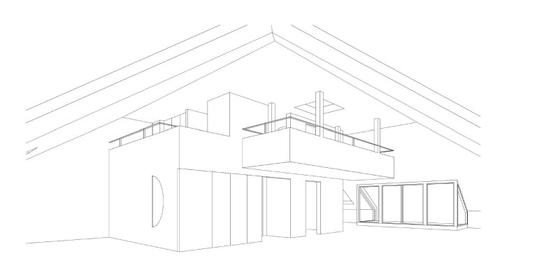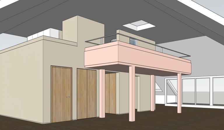 Clever interior layout: a compact central block integrates the entrance, sanitary facilities and storage modules. The mezzanine accommodates a kitchenette and multi-purpose areas, all elegantly suspended from the concrete ceiling.