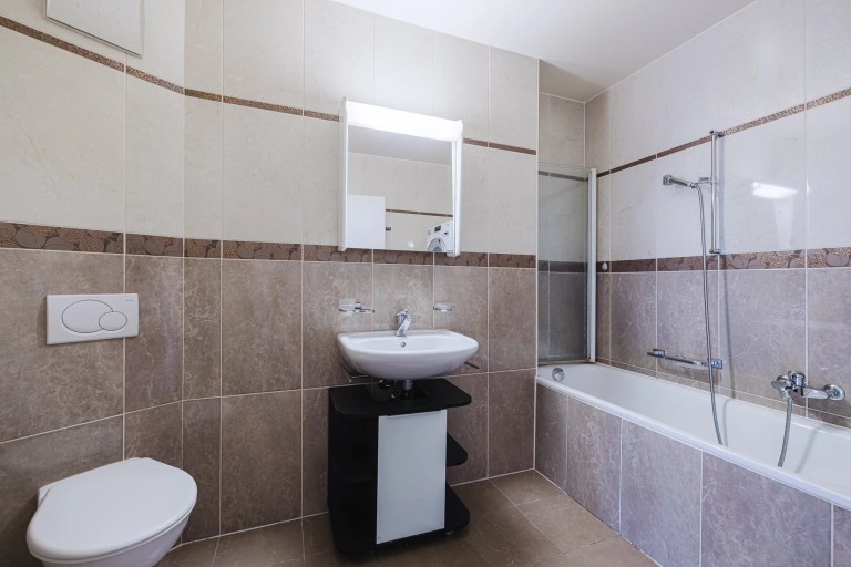 The remarkably spacious and convivial living area includes a large living/dining room bathed in natural light, with direct access to the balcony, as well as a functional open-plan kitchen that can be renovated to suit your needs. A guest toilet completes the living area.