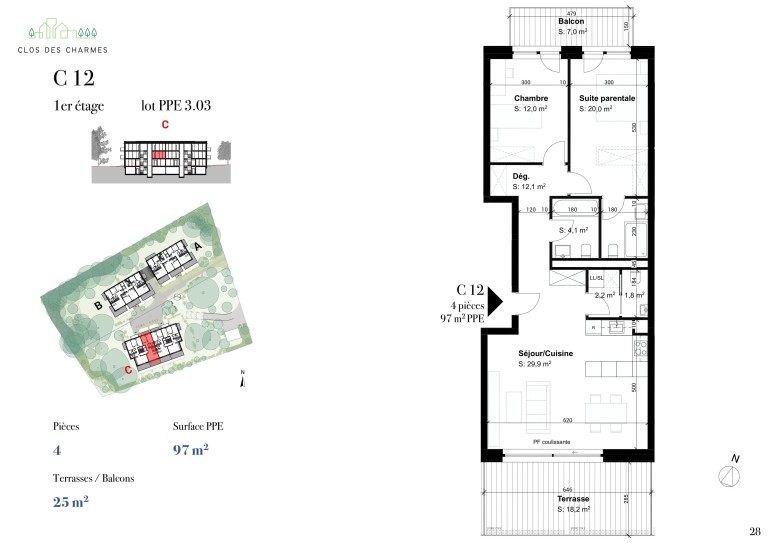 It offers generous, luminous volumes for a 97 m² PPE surface area and a 25 m² terrace.