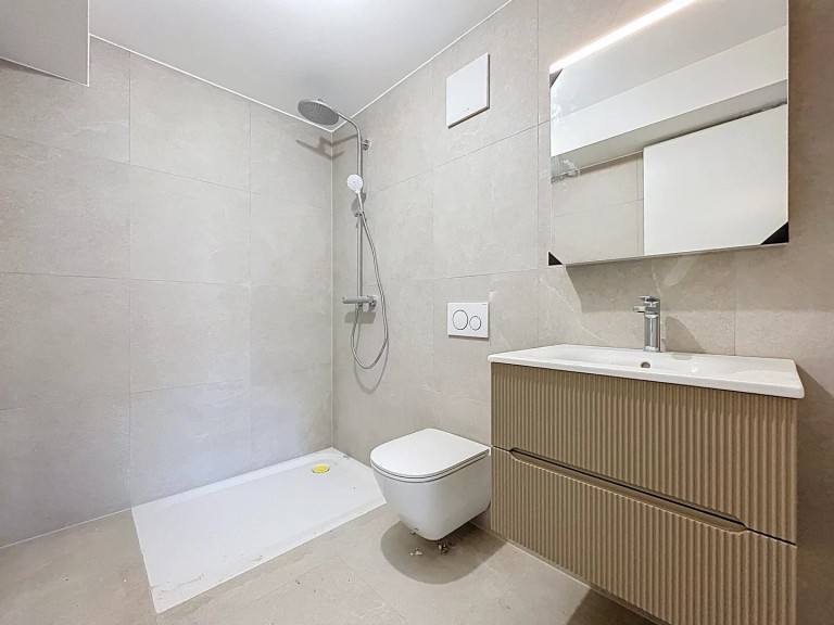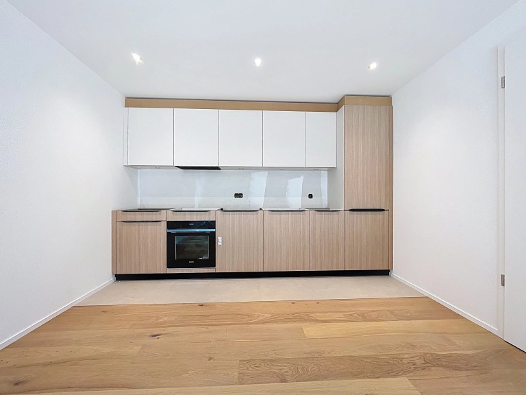 Living area: a corridor leads to a spacious living room with open-plan kitchen and dining area. A guest toilet and bathroom complete the layout. The living area opens onto the 56 m² south-facing garden, ideal for enjoying pleasant moments after a long day.