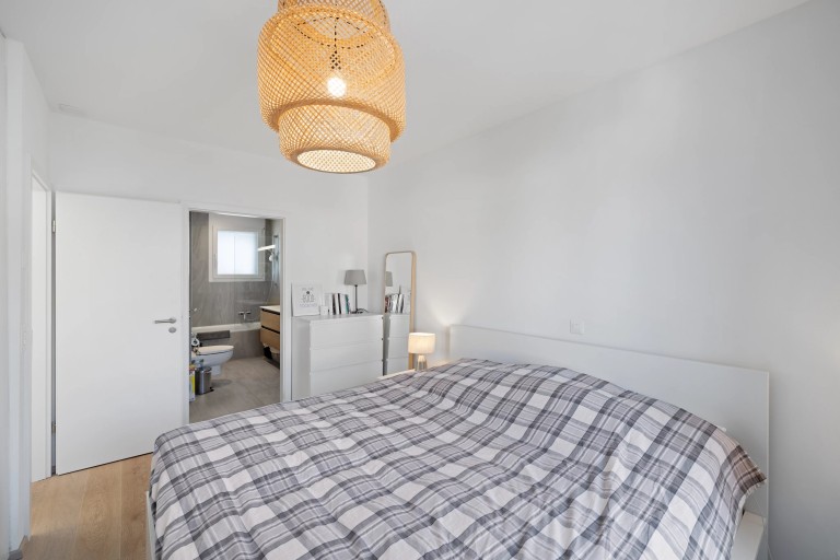 The living room then opens onto a vast open-plan living area comprising kitchen, dining room and lounge. As soon as you enter, natural light floods into the room, and the unobstructed view immediately catches the eye. Large bay windows extend this space out onto the 60 m² south-facing terrace, ideal for enjoying the sunshine all year round.