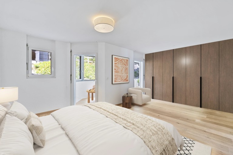 Facing east, it offers a splendid unobstructed view of the town and the castles, in a quiet, unspoilt setting with no direct neighbours. Nestled on the upper ground floor of a small luxury building built in 2003, it has exclusive access via a private tunnel, guaranteeing tranquility and privacy.