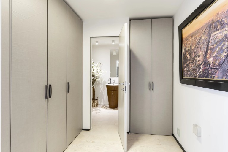 An elevator takes you directly to the apartment. As soon as you enter, a vast, bright living room welcomes you, completed with fireplace and balcony, and extended by a kitchen with central island and pantry.