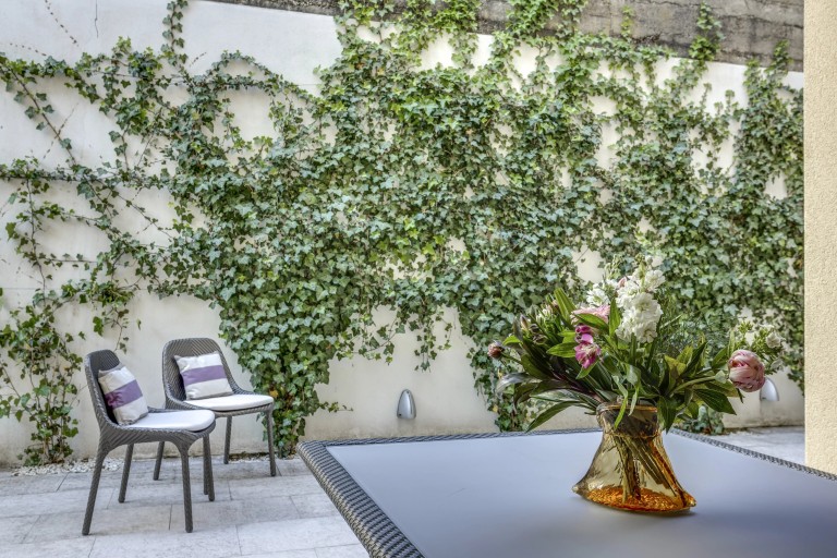 A private terrace provides a haven of peace in the heart of the city. Underground parking with electric hook-up is available.