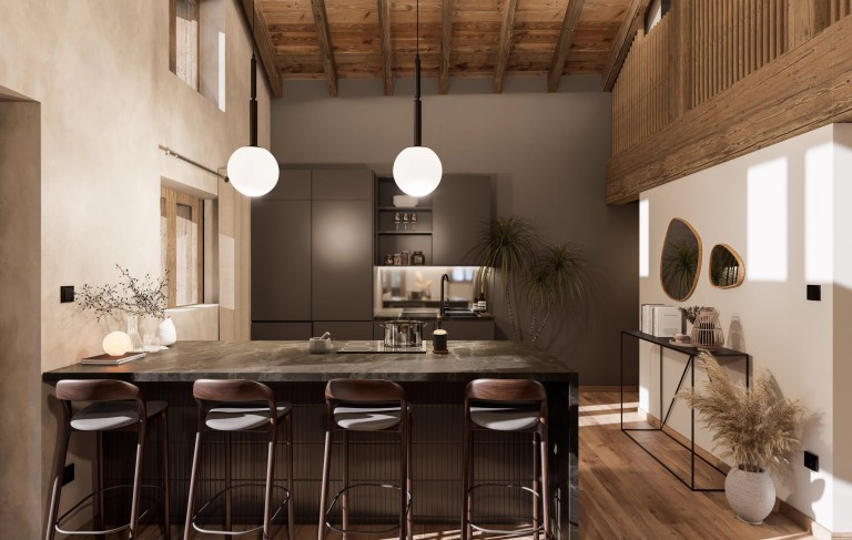 First floor: a large open-plan space comprising kitchen, dining room and living room, with part of the room benefiting from high ceilings creating a cathedral-like living room. A mezzanine area completes this level, ideal for a sleeping area or children’s play area.