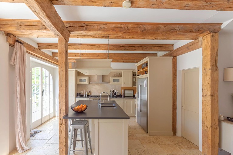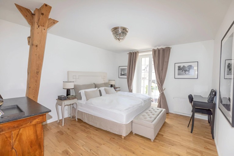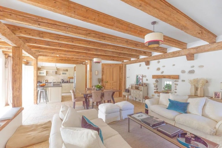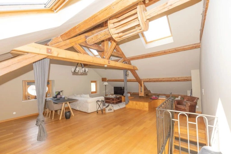 Spread over five split levels, the house impresses with its warm atmosphere and exceptional materials. Exposed beams, ancient stone walls, and bright living spaces create a truly unique and cosy ambiance. The ground floor features a generous 62 sqm living room with a fireplace, seamlessly connected to a dining area and kitchen, opening onto a terrace overlooking the garden.