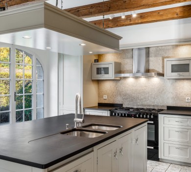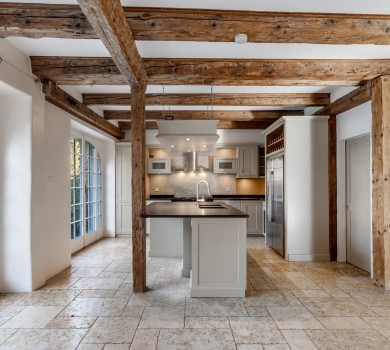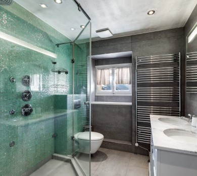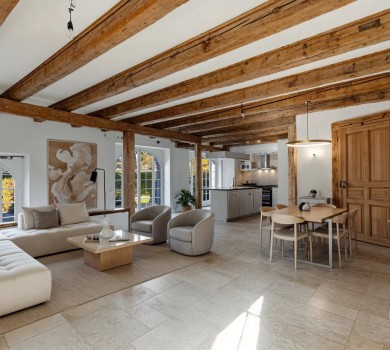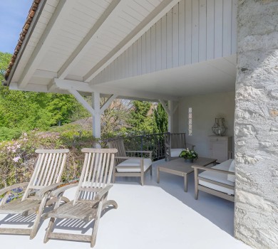 On the first floor, a vast living/dining room with fireplace opens onto a south-east oriented terrace and the pool. A top-of-the-range open-plan kitchen is extended by a veranda with walls that can be removed in summer days. An Argentinean barbecue adds a touch of convivialilty.