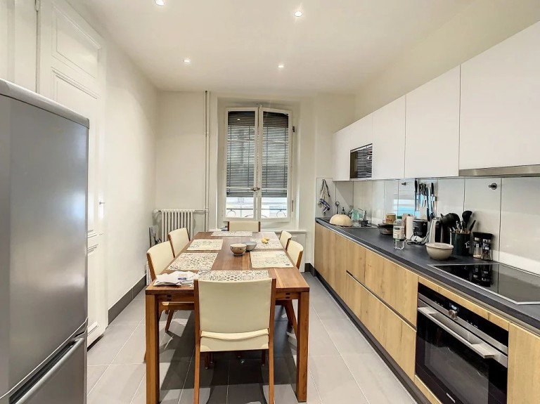Magnifique appartement de 5 pièces se composant comme suit : Un hall d’entrée, salon avec cheminée décorative et petite alcôve et salle à manger en enfilade, cuisine récente spacieuse entièrement équipée, WC séparés, 2 chambres à coucher dont principale avec salle de bains attenante et raccord pour machine à laver.