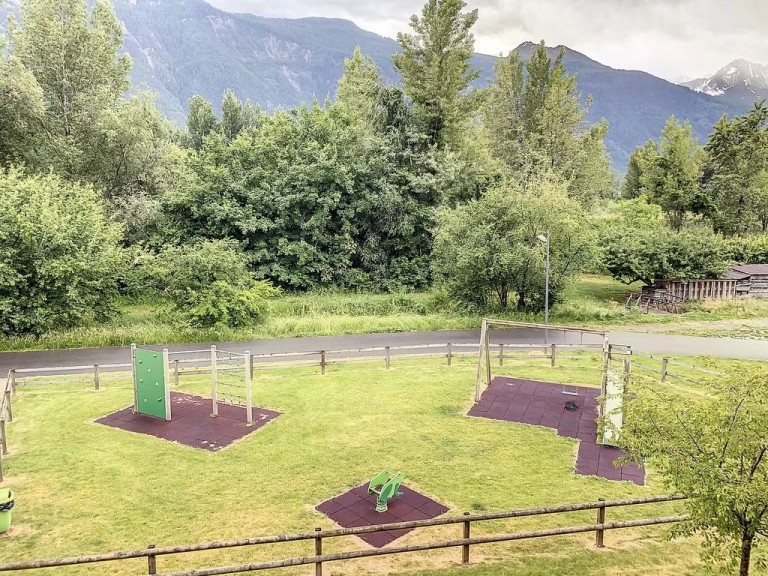 Accès direct à une place de jeu et au chemin des Berges du Rhône