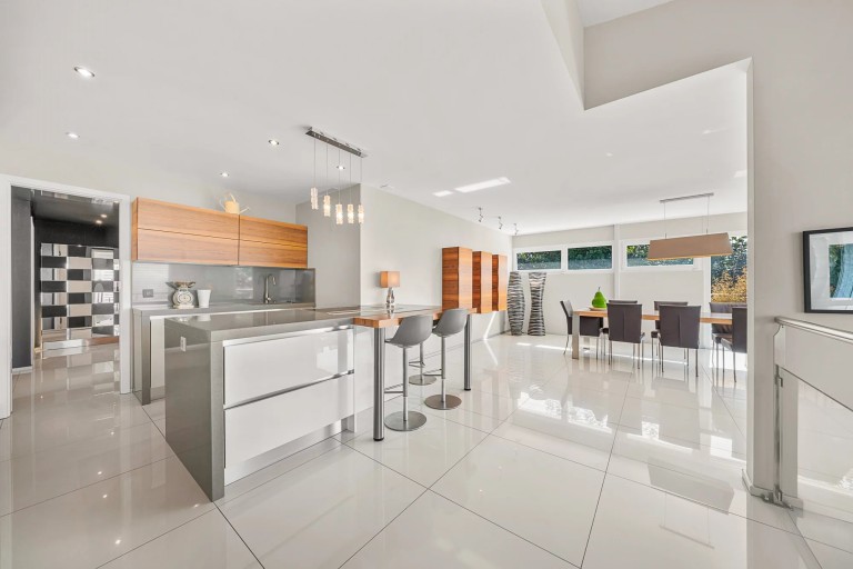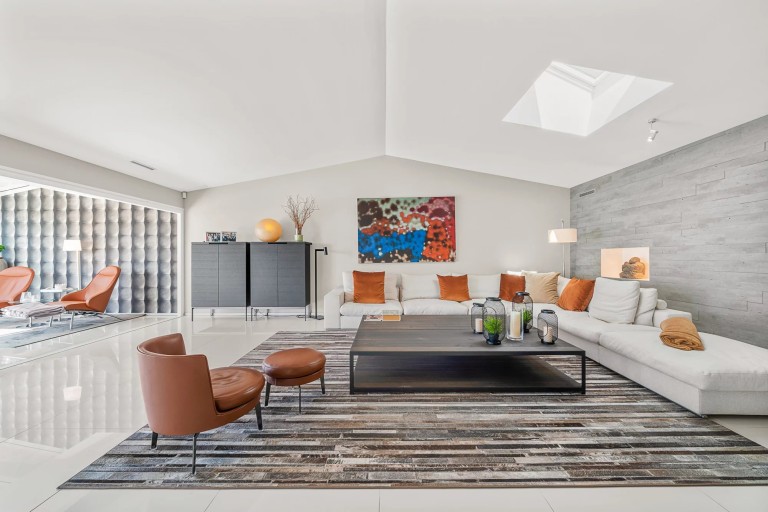 Le deuxième niveau, d’une superficie de 160 m2, se distingue par son vaste séjour baigné de lumière, prolongé par un jardin d’hiver offrant un accès direct à une terrasse de 107 m2 faisant le tour de l’étage. Une cuisine ouverte sur la salle à manger, élégante et fonctionnelle, s’intègre parfaitement dans cet espace de vie convivial. Cet étage comprend également une chambre en suite avec salle de douche et WC séparés ainsi qu’une entrée avec vestiaire et un WC visiteurs.