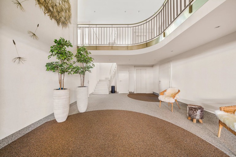 L’appartement bénéficie de quatre places de parking intérieures et d’un box privé (en supplément), ainsi que de deux caves, offrant un espace de rangement généreux. Depuis le garage, une belle entrée lumineuse mène à l’ascenseur desservant les étages.