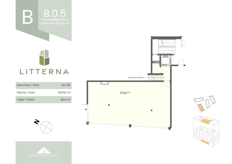 Mit 106,5 m² im Rohbauzustand und einer großzügigen Raumhöhe von 3,56m bietet sie maximale Gestaltungsfreiheit – ideal als Büro oder Showroom.