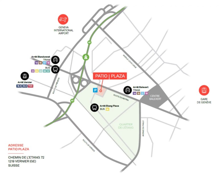 De par sa proximité de l’aéroport International de Genève et de sa grande desserte en transport public, le pôle d’activité « Patio Plaza » vous garantit une localisation de premier choix.