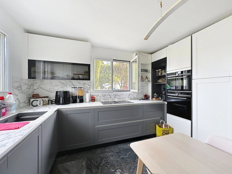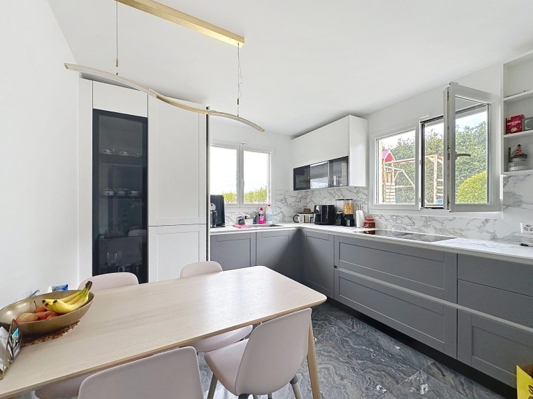 Rez-de-chaussée : Hall d’entrée avec placards intégrés, toilettes visiteurs, salon/salle à manger spacieux avec cheminée donnant accès à une véranda lumineuse utilisée comme salon TV, 2ème petit salon avec piano, cuisine habitable entièrement équipée. Le rez-de-chaussée donne accès à une agréable terrasse et au jardin avec vue lac.