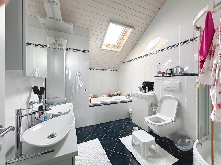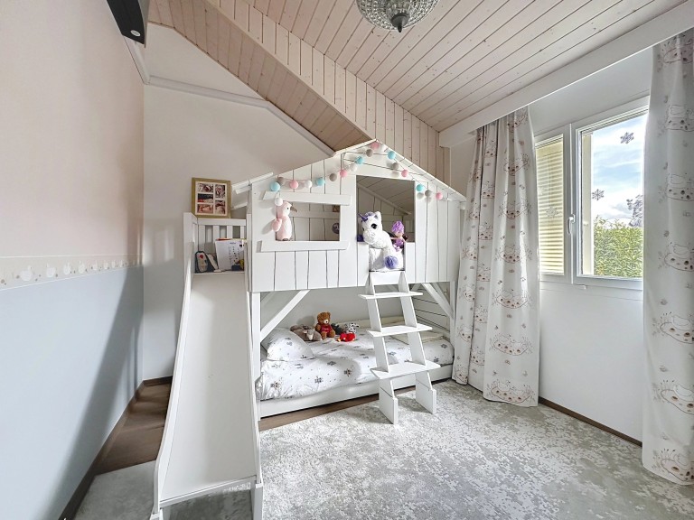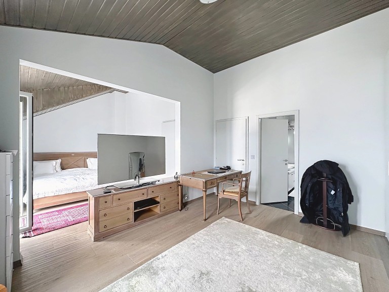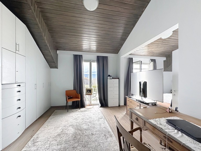 Premier étage : Chambre à coucher principale avec dressing et salle de bains complète attenants donnant accès à un balcon avec vue exceptionnelle sur le lac, chambre enfant, 1 salle de bains supplémentaire (Possibilité de créer 3 chambres à coucher en cas de besoin).
