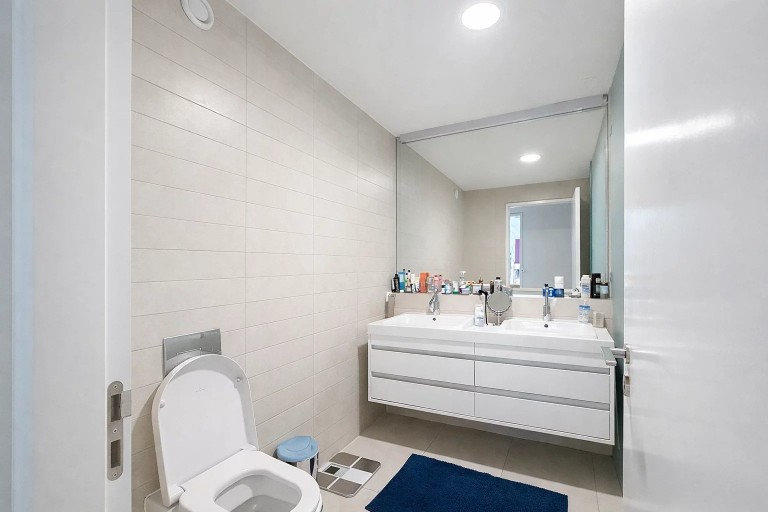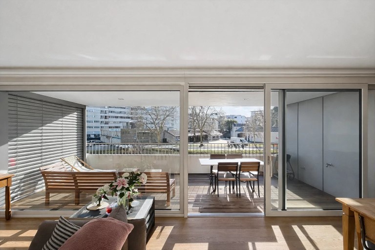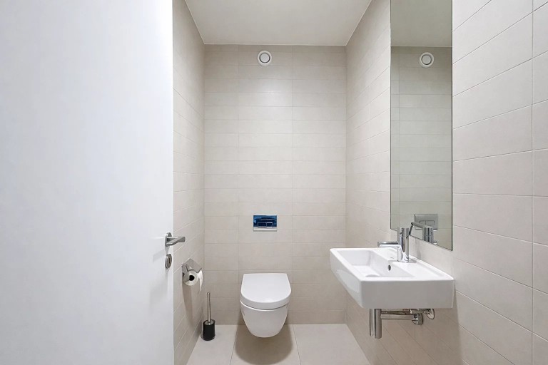 A noter que l’immeuble est chauffé par le sol grâce à un chauffage à distance et que des panneaux solaires assurent la production d’eau chaude sanitaire.