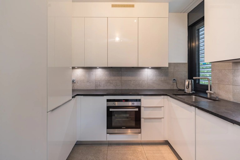 L’appartement, d’une surface pondérée de 107m2, dispose de deux chambres en suite, l’une avec salle de bain baignoire, l’autre avec une salle de douche à l’italienne. La cuisine entièrement équipée, ouverte sur un séjour lumineux, s’ouvre sur une terrasse spacieuse de 67 m2, offrant une vue dégagée sur le calme et la sécurité du parc de la Croix Rouge (IFRC).