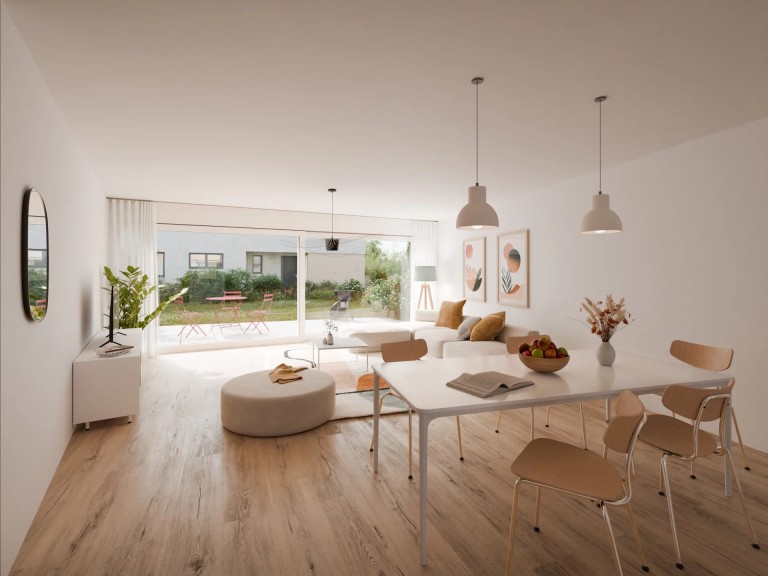 La résidence s’inscrit dans un concept architectural soigné, organisé autour d’un vaste espace central paysager favorisant la convivialité et la qualité de vie. Les logements offrent des surfaces généreuses et des espaces de vie lumineux, avec un accès à un extérieur privatif, terrasse, balcon ou jardin, selon la typologie.