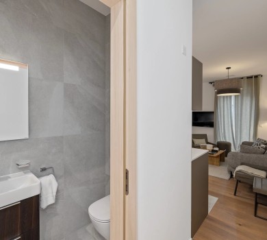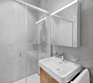 En franchissant le seuil, un hall d’entrée équipé d’armoires murales accueille les visiteurs et distribue harmonieusement les espaces. On y trouve également une première salle de douche avec WC, pratique et fonctionnelle.