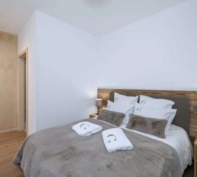 La partie nuit se compose d’une chambre parentale avec salle de bains privative, ainsi que d’une seconde chambre. Toutes deux bénéficient d’un accès direct au grand balcon de 27 m² côté nord, offrant une vue imprenable sur la ville de Sion et ses châteaux.