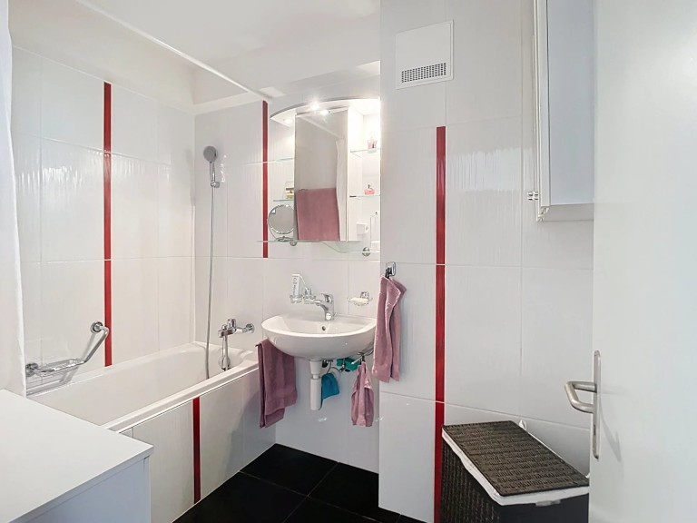 Sa distribution est plaisante. Il dispose d’un hall d’entrée avec armoires vestiaire, un séjour/salle à manger de 31,7m2 généreusement vitré sur le balcon, cuisine généreusement agencée (2016) de 7,75 m2 ouverte sur l’espace à manger, un WC invités et une salle de bains/lavabo (2013) avec possibilité d’installer un second WC ou une colonne de lavage, deux chambres (15/11 m2). Les sols ont été refaits en 2018, ainsi que les peintures en 2017.