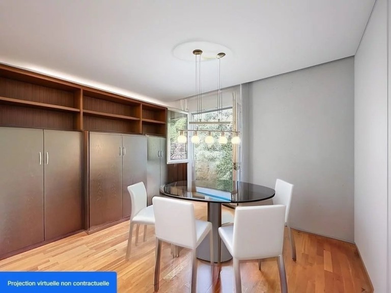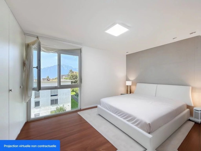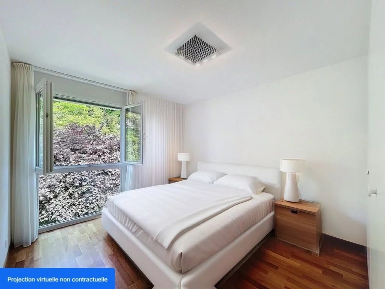 -Chambres confortables : Une chambre principale de 14m² avec vue sur le lac, et trois autres chambres de 10 à 12 m², donnant sur un espace vert à l’arrière de l’immeuble sans vis-à-vis.