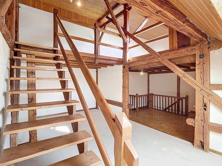 Entrée privative, via la terrasse, ce logement atypique est composé d’un espace de réception généreusement vitré (ancienne porte de grange) d’un espace cuisine qui a conservé le manteau de son ancien âtre et équipé d’une cheminée à bois, un WC invités, l’étage est composé d’un espace bureau, une salle de bains/WC (à rénover) un petit salon et/ou espace dressing, le tout surplombé par une mezzanine permettant d’y d’installer une spacieuse chambre. Magnifique poutraison apparente chevillée.