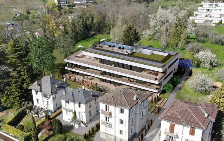 Labellisé Minergie, cet immeuble de seulement 8 appartements, inspiré par l’esthétique d’un bateau de croisière. Chaque logement est orienté plein sud, baigné de lumière naturelle, avec vue partielle sur le lac et les Alpes. Le bâtiment comprend une piscine panoramique sur le toit, pour des moments de détente inégalés.