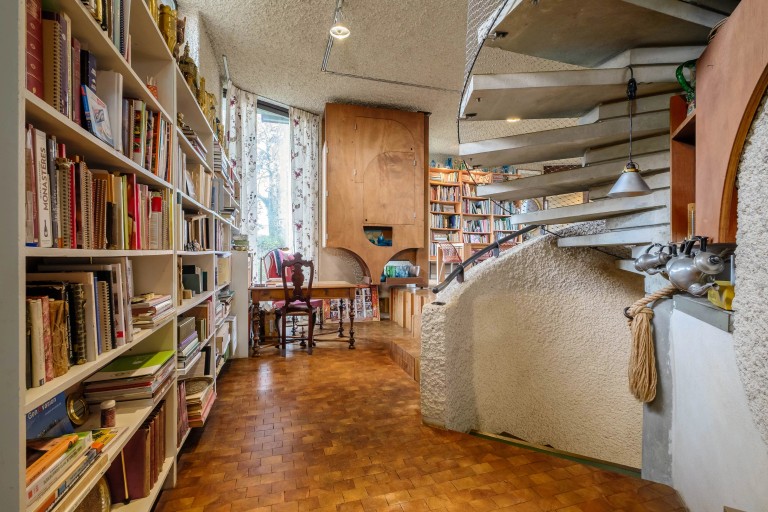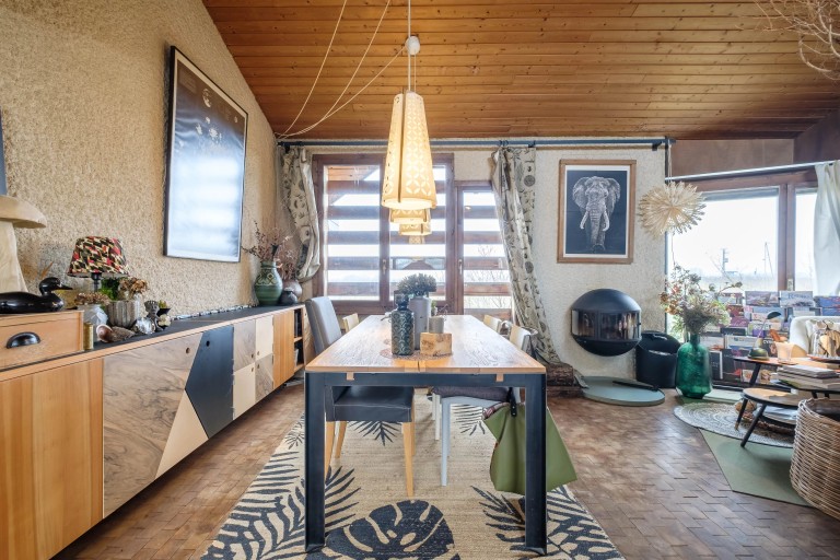 Les pièces de réception, baignées de lumière naturelle, offrent de magnifiques hauteurs sous plafond, créant une atmosphère chaleureuse et aérienne. L’architecture, résolument originale, s’adresse aux amoureux de biens de caractère et d’ambiances uniques.
