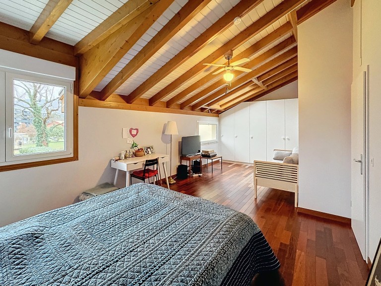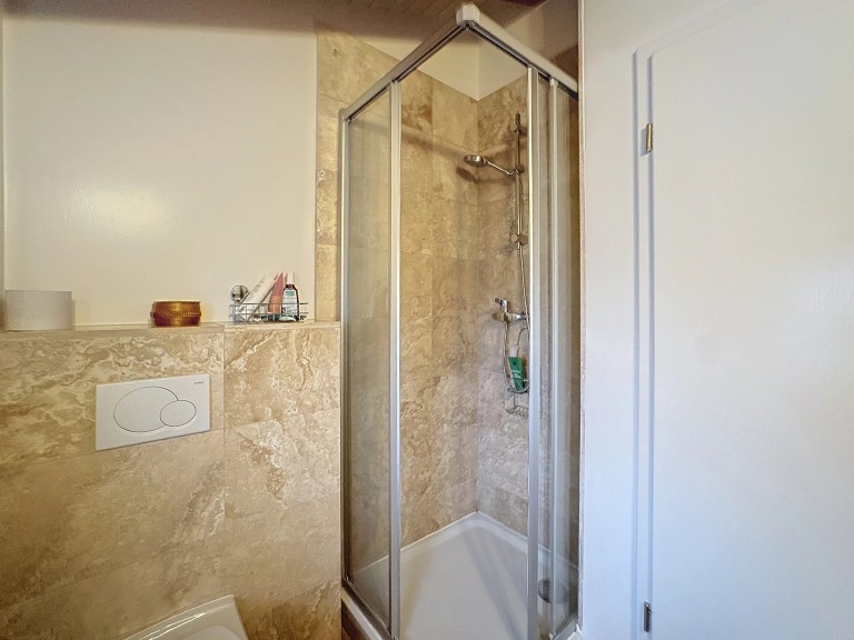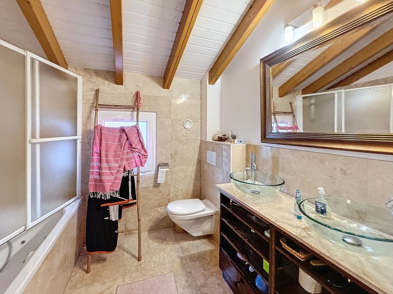Quatre chambres occupent le premier étage, toutes avec des poutres et une belle hauteur de plafond. Les sanitaires comprennent une salle de bains et une salle de douche.