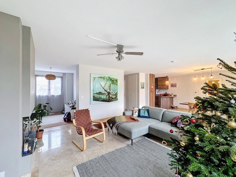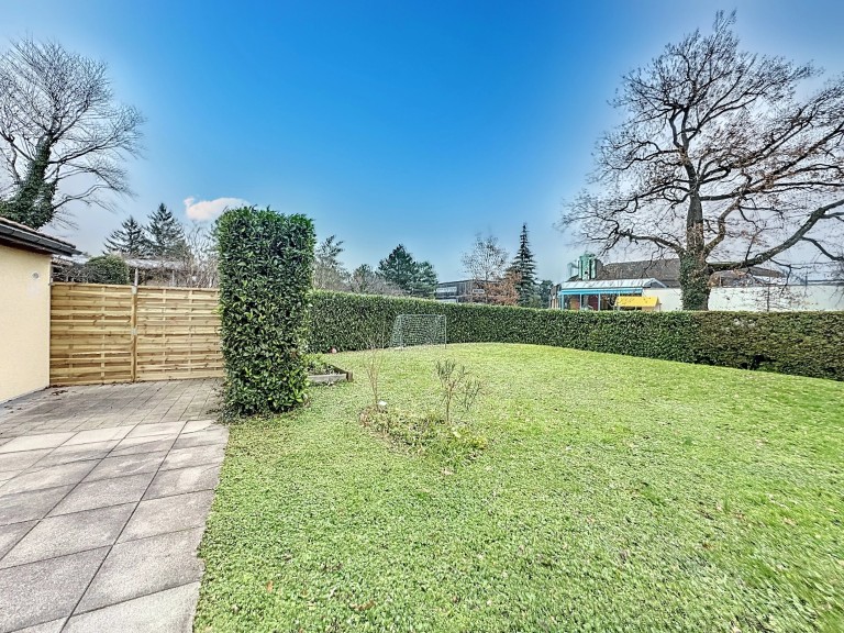 Plane et clôturée, la parcelle est assez grande pour y jouer et y jardiner. La terrasse est équipée d’une tente solaire.