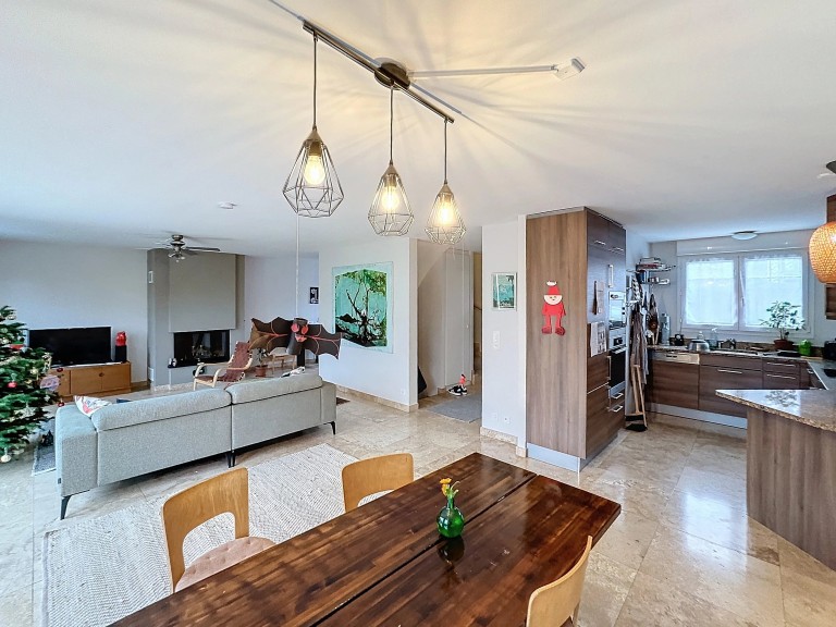 Lumineux, le rez-de-chaussée accueille une grande pièce de réception en L avec cheminée, utilisée en salon et salle à manger. Viennent ensuite la cuisine ouverte et des toilettes pour les invités.
