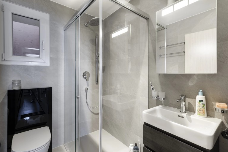 Au rez inférieur, vous trouverez trois chambres orientées Sud, avec une salle de douche avec WC et lavabo, ainsi qu’une buanderie/garderobe, une cave et un abri PC.