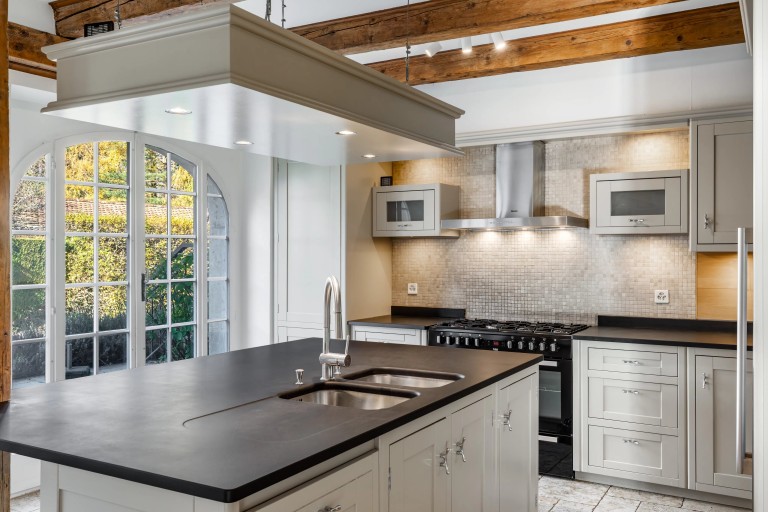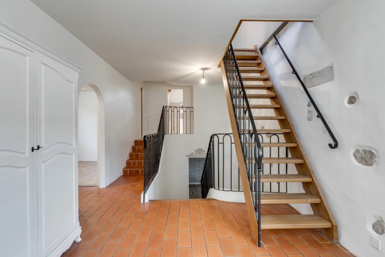 La maison séduit dès l’entrée par son ambiance chaleureuse et ses matériaux d’exception. Les poutres apparentes, les murs en pierres anciennes et les espaces lumineux confèrent une atmosphère douce et unique.
