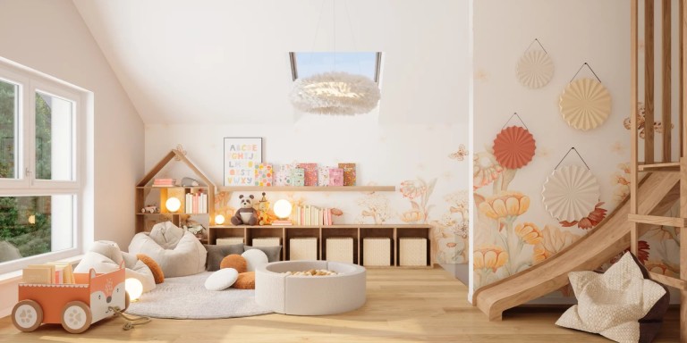 Le niveau des combles est livré entièrement fini : parquet, chauffage au sol et murs revêtus d’un élégant lambris blanc, pour créer une atmosphère chaleureuse et raffinée.