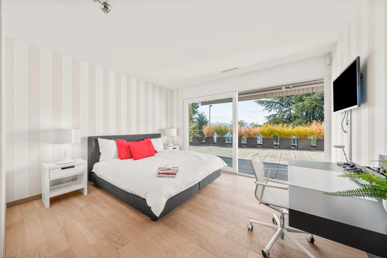 Située dans une résidence exclusive de seulement deux logements, cette maison jumelle offre des volumes généreux, une architecture élégante et une vue spectaculaire sur le lac.