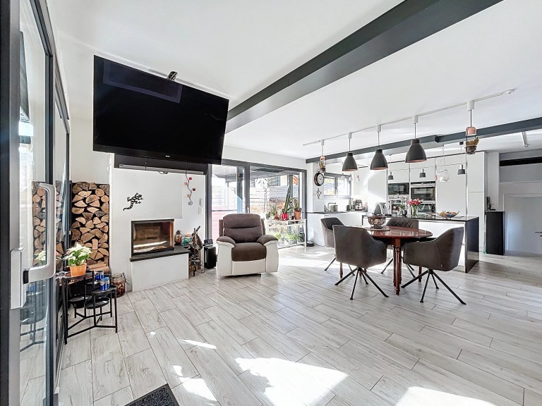– Séjour avec cheminée et accès terrasse, jardin et véranda