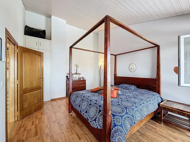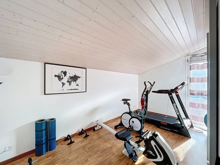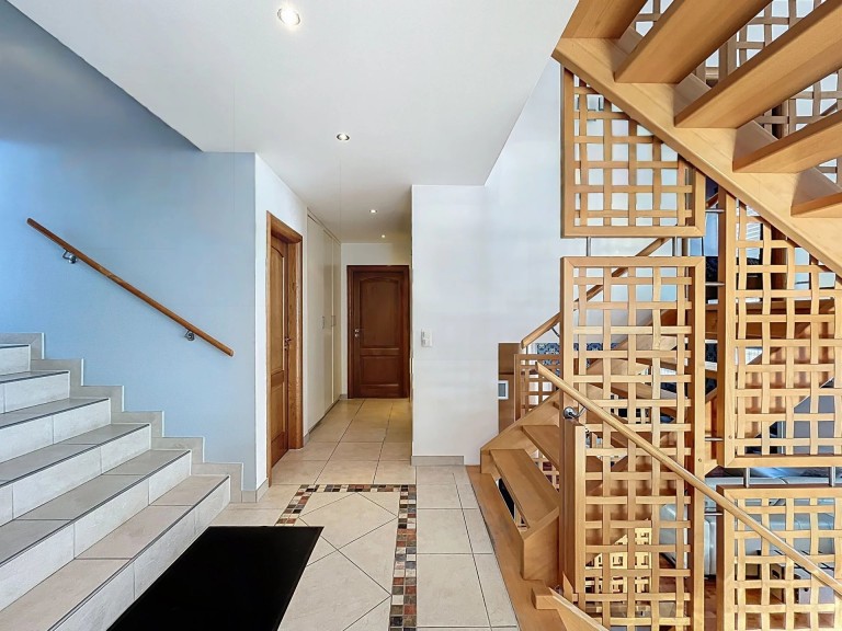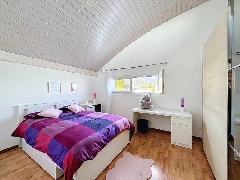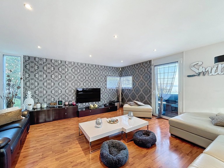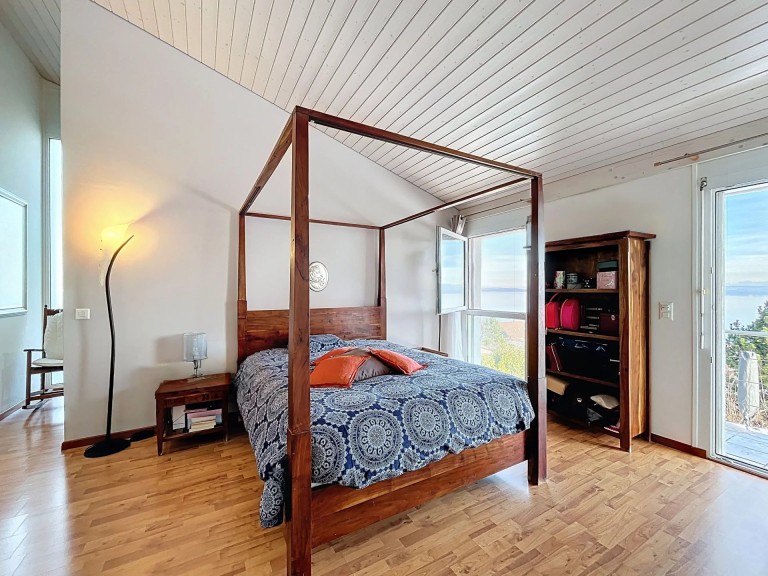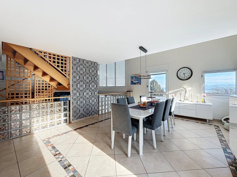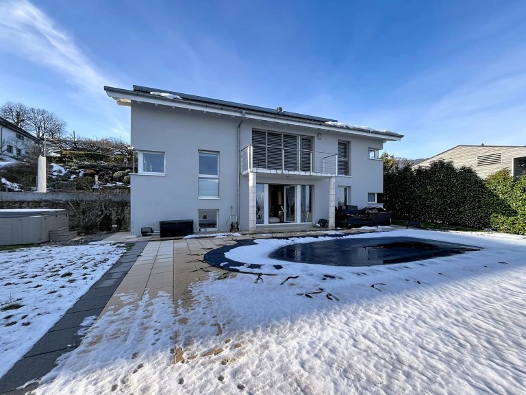 À l’extérieur, la propriété propose un véritable lieu de détente à l’abri des regards. La terrasse en pierre naturelle prolonge harmonieusement les espaces de vie et mène à une piscine chauffée ainsi qu’à un jacuzzi, le tout entouré d’un jardin soigneusement entretenu. Cet ensemble crée une atmosphère paisible, idéale pour profiter pleinement du panorama exceptionnel sur le lac et les Alpes. La présence d’un garage et de places de stationnement complète confortablement les prestations, tout comme l’accès à un bus scolaire privé dès l’âge de 4 ans, un atout rare pour les familles.